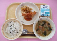 ・むぎごはん・チキンごぼう・白菜のおひたし・にらたまじる・牛乳