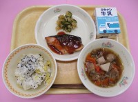 ・ゆかりごはん・じゃがいものそぼろ煮・チンゲン菜のあえもの・なし・牛乳