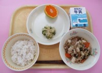 ・むぎごはん・すきやき煮・すのもの・みかん・牛乳