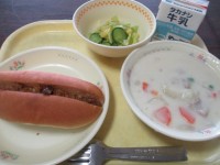今日の献立は、ドライカレーサンド、じゃがいものクリーム煮、キャベツとコーンのサラ...
