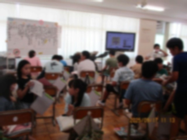 とてもきれいな歌声は6年生でした。「HEIWAの鐘」という合唱曲に挑戦しています。とても歌が得意な6年生ですから、中高生向きの難曲にも意欲的です。授業の終わりには振り返りをしながら、友達と交流していました。パートを確定していくようです。