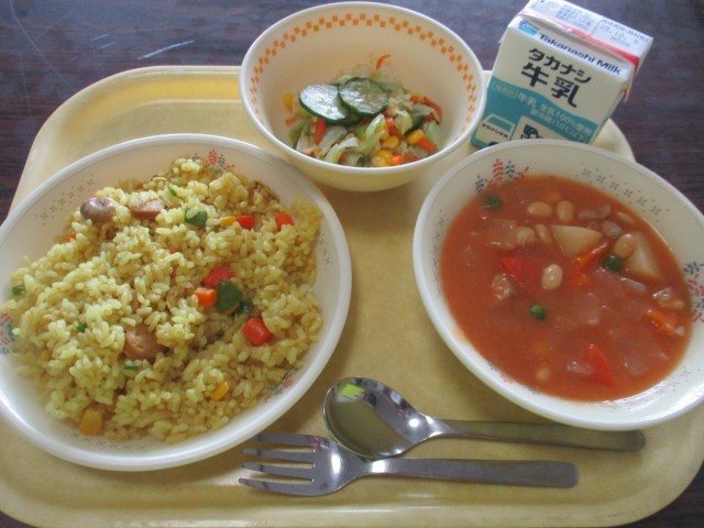 今日の献立は、カレーピラフ、チキンビーンズ、ボイル野菜、牛乳です。とても色合いがきれいですね。ピラフは、お米をバターや油で炒めてから、肉や魚介類、野菜、香辛料などを加えて炊き上げる料理です。今日は、調理員さんが30kgのお米をよく炒めてから炊いてくれました。鶏肉やウィンナー、マッシュルーム、コーンなどを加えて食欲のでるカレー味にしました。残さず食べられると嬉しいです。