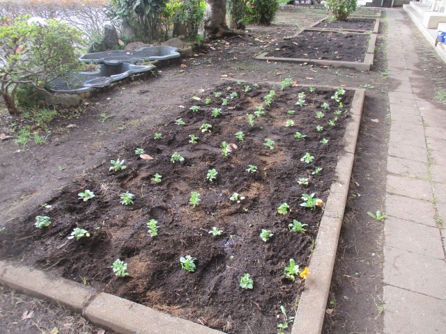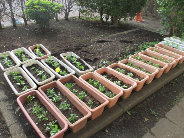 昨年度に続き、「ミニストップ花の輪運動」によるお花の苗をいただきました。3品種(パンジー、ビオラ、ノースポール)で200株もあります。昨年は、卒業式から入学式、そしてゴールデンウィークまで、開校70周年の幕開けをきれいに彩ってくれました。今年も、園芸委員会の子供たちや地域の「森っ子ガーデンを育てる会」の皆様と大切に育てていきたいと思います。27日の委員会活動で、整えておいた花壇やプランターに苗を植えました。今年は昨年より少し苗が大きめのような感じがします。来月の周年行事のときにはまだまだ咲きませんが、春が楽しみになりました。