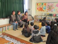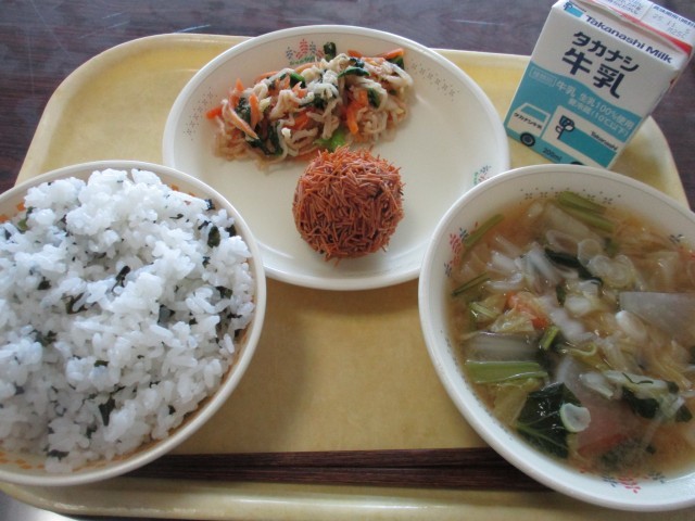 今日の献立は、わかめごはん、いがぐり揚げ、さつまいもと白菜の味噌汁、野菜のごま酢和え、牛乳です。いがぐり揚げは、鶏肉と豆腐、ねぎ、生姜、たまごなどを合わせて丸く形を作り、まわりにそうめんを付けて揚げたものです。茹でて食べると美味しいそうめんを、乾燥した状態のまま小さく切り、栗のイガに見立てました。パリパリとした食感とほどよい塩味が美味しいですよ。