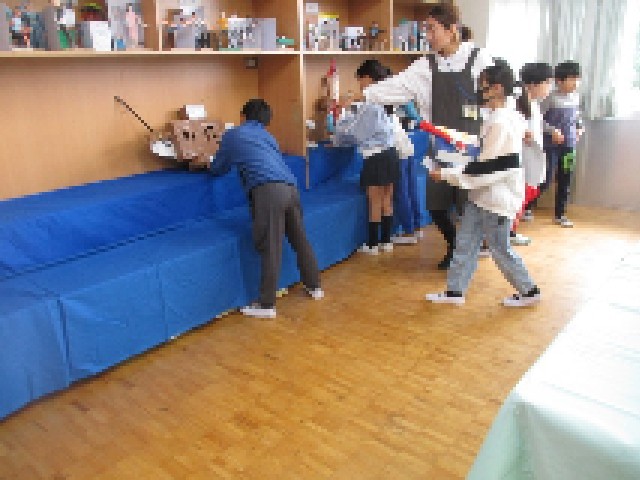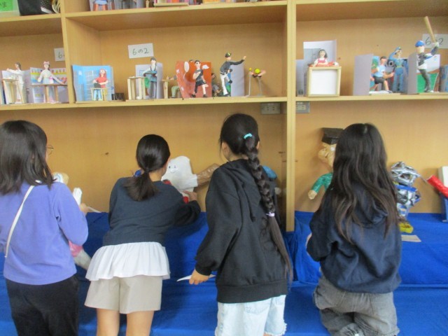 今日は時間帯を少しずつずらして、立体作品の展示になります。朝の時間は4年生でした。展示台に自分の作品を大切そうに並べました。