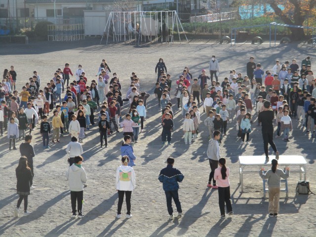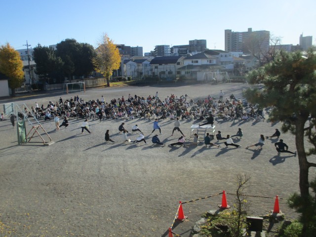 今日の体育朝会は「持久走月間」に合わせたものでした。みんなで準備運動をしてから、ひざや足を意識しながらその場駆け足をしました。2回目は、もっと速く動かそうという体育委員会の声かけで、頑張りました。