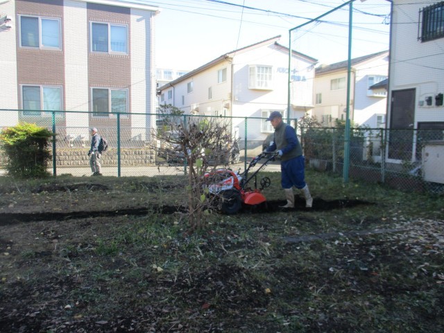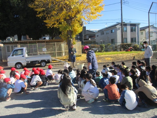 昨年度から始めたものに「腐葉土づくり」があります。けやきなどの落ち葉や米ぬかを入れて、時折かき混ぜてきました。立派な腐葉土が出来上がりました。この腐葉土を来年の畑づくりをする場所に撒くことを、1年生がします。今回もけやきの落ち葉を近くの皆さんからいただきました。イチョウの葉っぱが入ってはいけません。土作りの大切さや自然の素晴らしさを、1年生なりに感じているでしょうか。子供たちがまんべんなく撒いた後は、耕運機で混ぜました。
