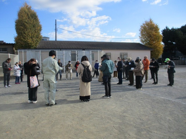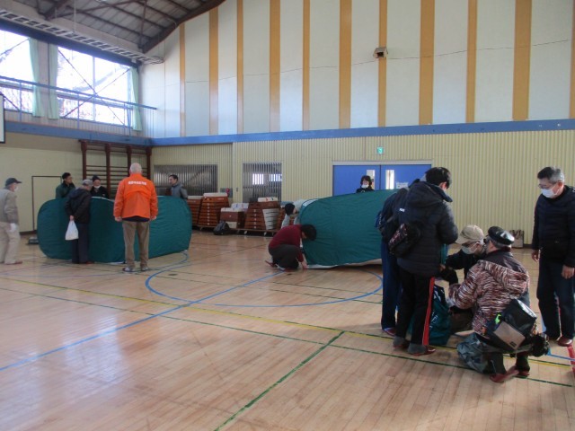 今日は年に1度の避難施設開設訓練です。地域の関係団体の代表者30名くらいが集まりました。町田市の防災課や町田市の避難施設指定職員の進行で、各プログラムをすすめました。はじめは、体育館内で屋内用テントやファミリールームの設営を実際に行いました。その後、防災倉庫の確認をします。