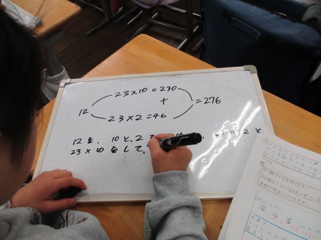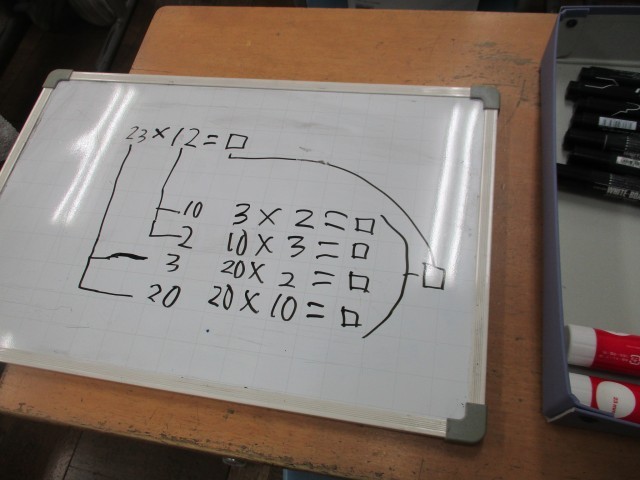 今日は先生方の授業研究をしました。3年生の授業のはじめには「ジャマイカ」という数字でのあそびをしていました。前に講師の先生が、数あそびの一つとしてご紹介したくださったものです。2けた✕2けたのかけ算の仕方を、自分なりに考えて説明しました。