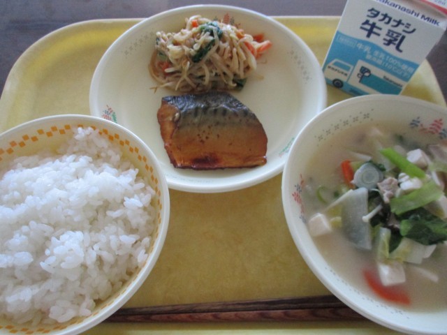今日の献立は、町田のごはん、鯖のてりやき、町田の野菜のみそスープ、野菜のごま和え、牛乳です。今日は「まち★ベジ給食」です。町田市内でとれたお米を炊き、大根、白菜、小松菜、ねぎを使って汁物を作りました。7月にも行った取り組みで、「町田市の農産物をもっと子供たちに食べてもらいたい」と市内全小学校で行われています。町四小に届いた野菜は、主に上小山田地区でとれたものです。新鮮な町田の野菜と米を味わってください。