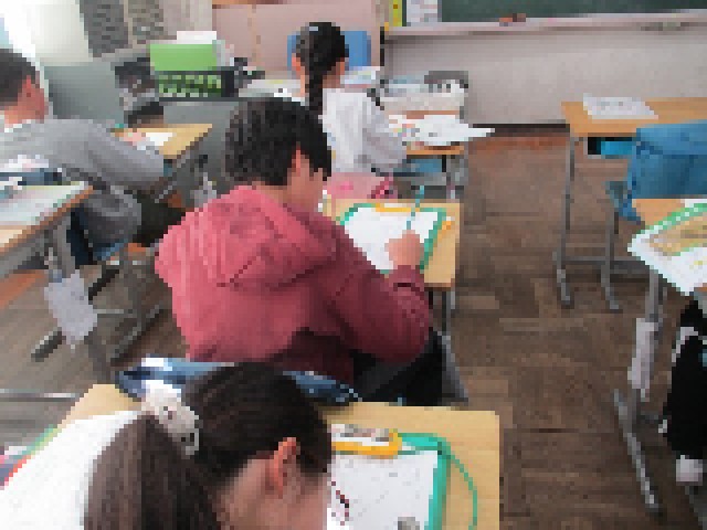 4年生の理科は、1週間3時間の理科のうち1時間は担任、2時間は専科という形ですすめています。今日は、春から定点観察をしている「サクラ」の観察でした。サクラの枝や葉の形や色、あるいは木全体の変化などをスケッチして、カードにまとめていきます。一人ひとりがとても真剣に取り組んでいました。