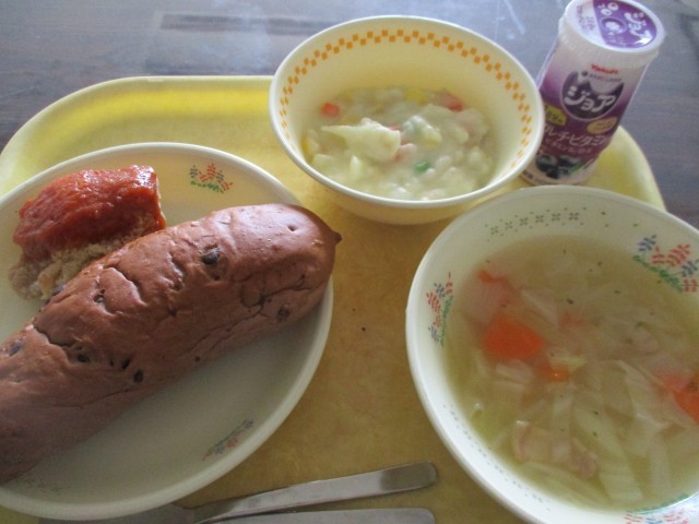 今日の献立は、チョコチップパン、チキンのトマトソースがけ、星のパスタの野菜スープ、カラフルマッシュポテト、乳飲料でした。年内最後の給食です。子供たちが大好きな唐揚げに色鮮やかなトマトソースが、ちょっとしたごちそう感を出しています。野菜スープも野菜やベーコンの旨味がたっぷりで、体が温まりました。栄養士さん、調理の皆さん、ごちそうさまでした。