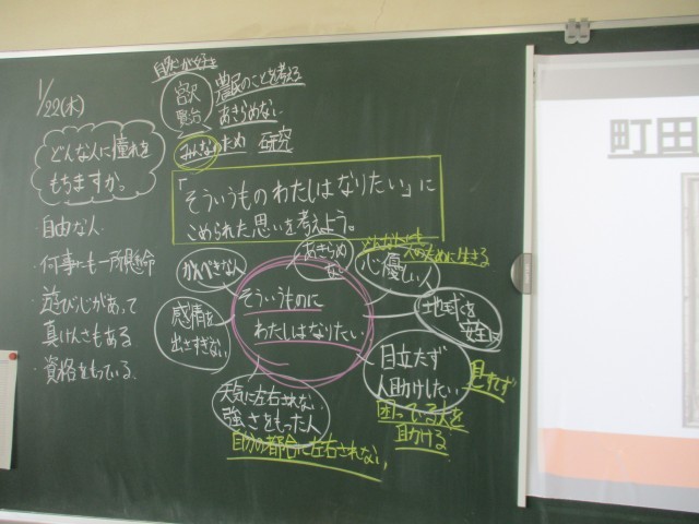 さきほどの授業と同じものを、授業者の先生のクラスで行いました。すべて校内の先生方に声をかけています。最高学年が近づいている5年生が、「生き方」や「なりたい自分」を考える授業です。予想通り45分では収まりきれない内容だったので、子供たちから出たことばを共有化するところは、15分のモジュール授業ですすめることになりました。子供たちの思いがたくさんあります。この思いを、町四小の教育目標と照らし合わせたいと考えています。