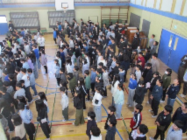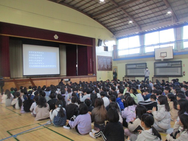 今朝の音楽朝会は第6回でした。それぞれの学級で音楽の授業で練習した「スマイル アゲイン」を合わせるために、4年生の並ぶ位置を変更した隊形です。座ったまま手話の確認をしてから、1〜3年生のソプラノパート、4〜6年生のアルトパートを聴き合いました。思わず拍手を送る姿が温かい気持ちになりますね。全校で初の「合唱」です。音の重なりが楽しみです。