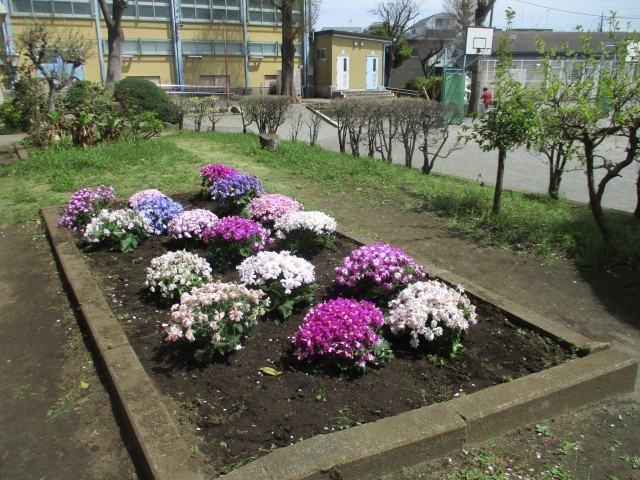 卒業式や入学式で飾った花鉢のサイネリアを、用務員さんに花壇に植えていただきました。せっかくのお花が少しでも長く楽しめるとうれしいですね。明日は恵みの雨かもしれません。
