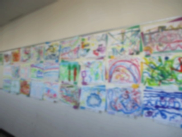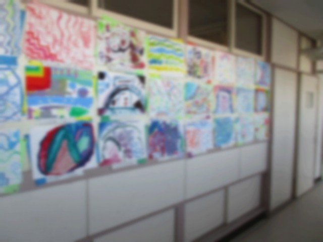 図工室前の廊下には伸びやかで明るい作品が掲示されていました。3年生の「絵の具と水のハーモニー」です。3年生から、図工の授業は専科の先生が担当しています。絵の具に混ぜる水の量や筆の動かし方をいろいろ試しながら、自由に描きました。作品の題名も「まほうのせかい」「ふしぎな点とお花のせかい」「うずまく町」「どうくつのいりぐち」「カラフルじま」など抜群のセンスですね。絵の具とも筆ともよい仲間になっているのですね。