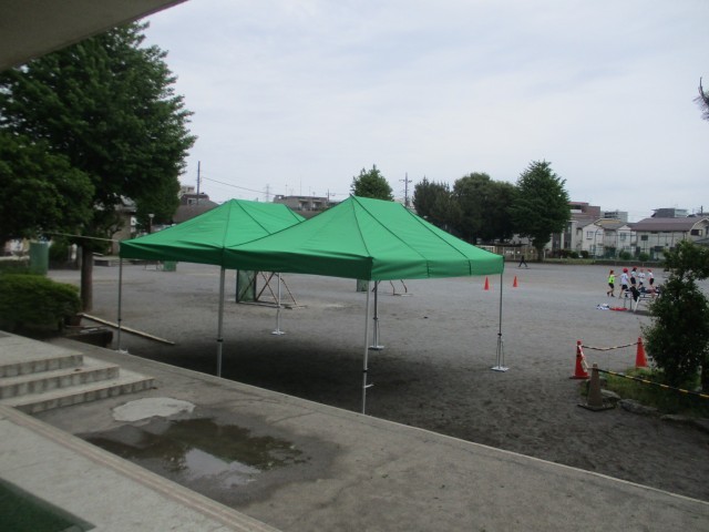 今日は、緑色のテントを2張、中央昇降口前にたてました。熱中症対策です。朝、入舎を待つ子供たちに日陰がないので、昨年度、PTAにお願いをしたところ、開校70周年の節目に、これまで貯めてきたベルマークと積み立てを使って購入してくださいました。学校カラー、森野カラーの「緑色」です。10月くらいまで、子供たちに日陰を提供してくれます。