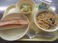 今日の献立は、セサミトースト、きのこのスープスパゲッティ、フレンチサラダ、牛乳で...