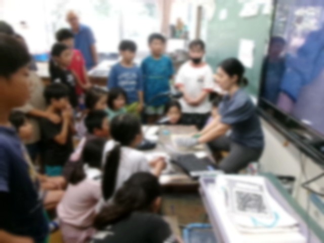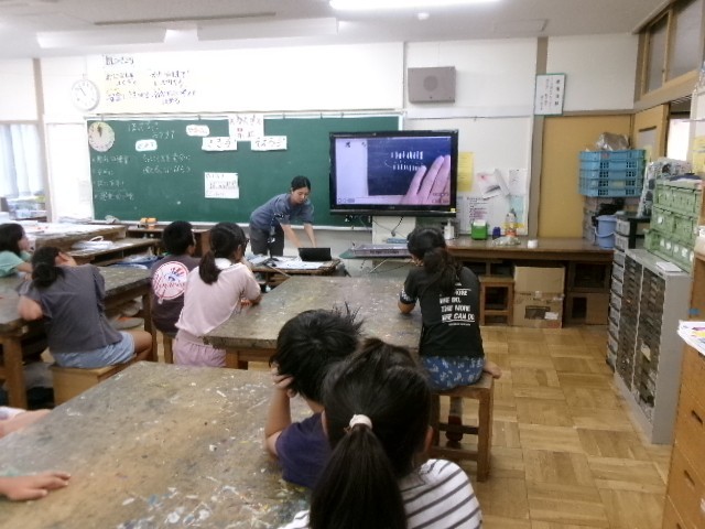 まず、使い方を動画で見ます。そして、図工専科が実演してみせます。子どもたちは、彫刻刀をどのように使ったらよいかを一生懸命見ています。