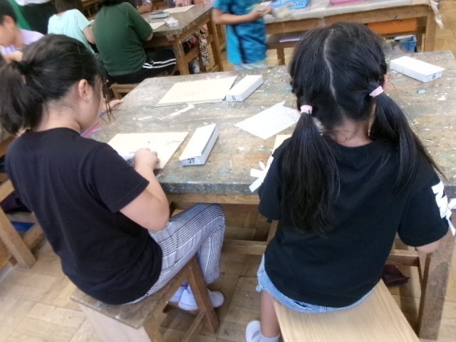 「もう少し彫刻刀を寝かせたほうがいいよ。」