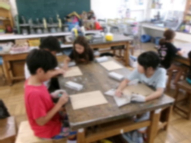 初めて彫刻刀を使う学習です。担任も一緒に見守り、安全に指導します。
