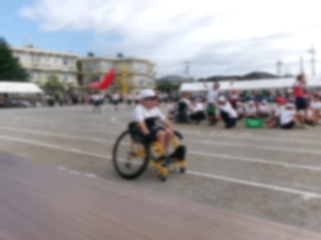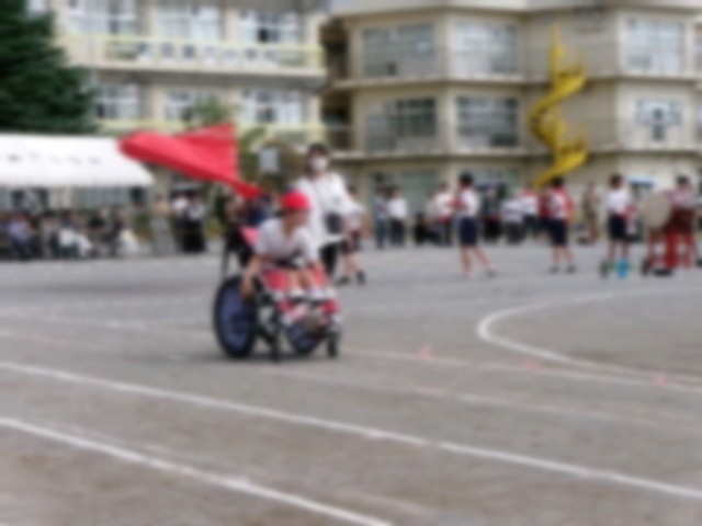 かけっこ・短距離走です。やまばと学級の子どもたちは自分で走る距離を決めました。車椅子や歩行器で懸命に走る姿に、多くの方々から拍手をいただきました。