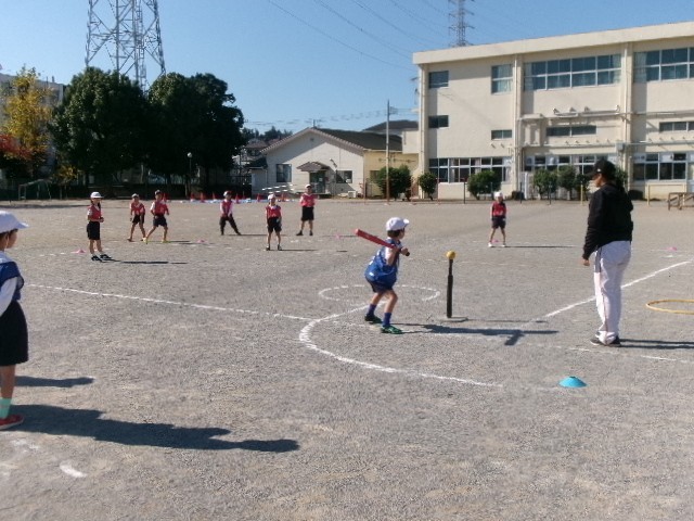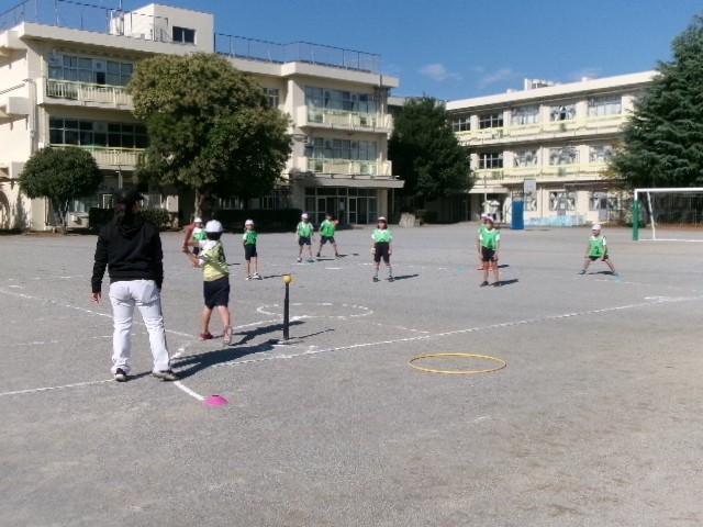 ジャイアンツアカデミーの選手が子どもたちに野球を教えてくださいました。晴天のもと、チームで対戦しました。振ったバットにボールが当たると、3年生はとても嬉しそうでした。