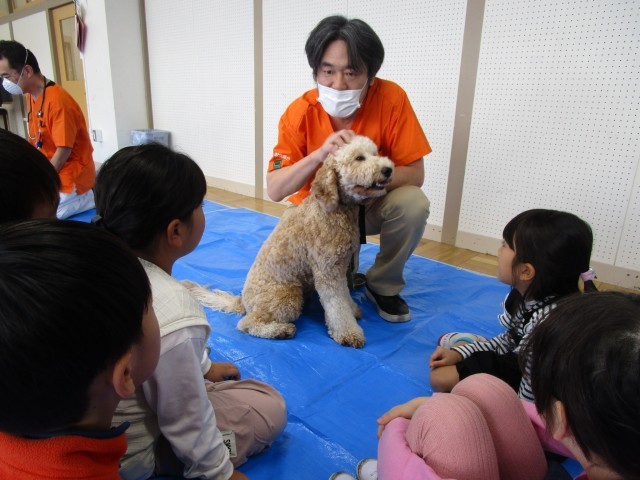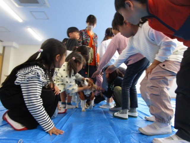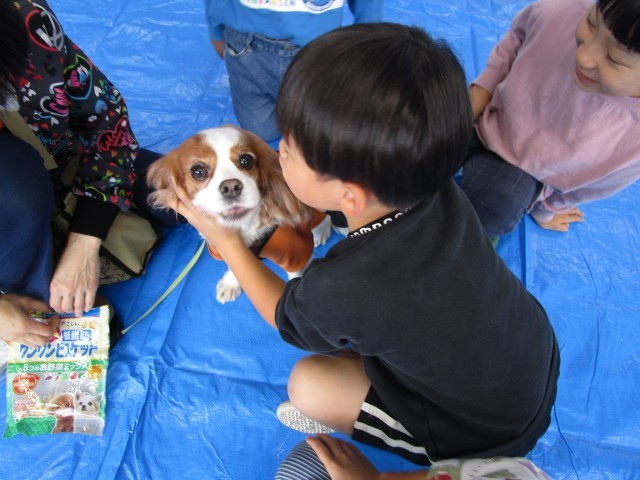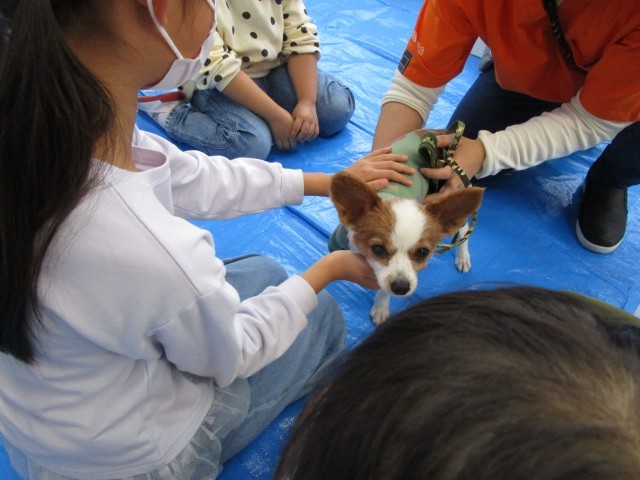 1年生が犬と触れ合う体験をしました。普段は触ったことがない子どもたちも犬の体を撫でていました。5匹の犬たちがとてもかわいかったです。