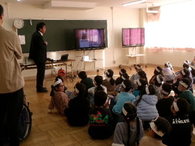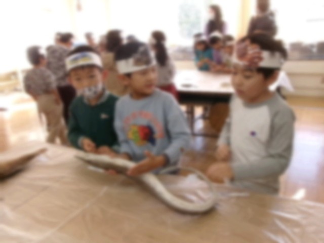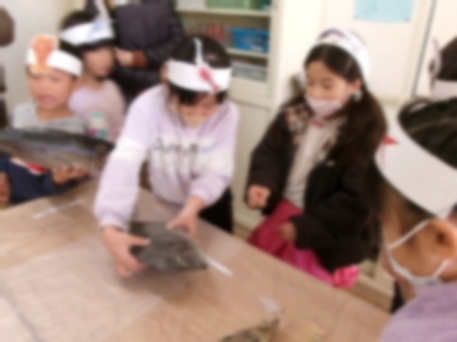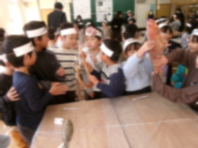 50種類の魚が高知県の漁港から学校に送られて来ました。副校長がピンチヒッターで講師となり、お魚クイズを出して子どもたちを盛り上げました。たくさんの魚を触ったり、口の中を見たりしながら、興味深く友達と話していました。