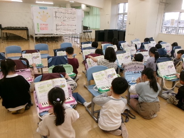 きれいな歌声が音楽室に響きます。この日のめあてがミニ黒板に書いてありました。鍵盤ハーモニカの学習では、指使いを懸命に練習しています。これから他の楽器と合わせて合奏に取り組むそうです。