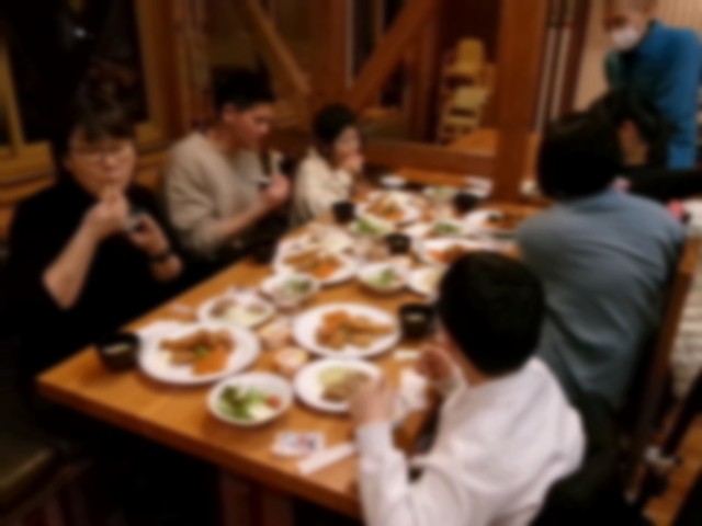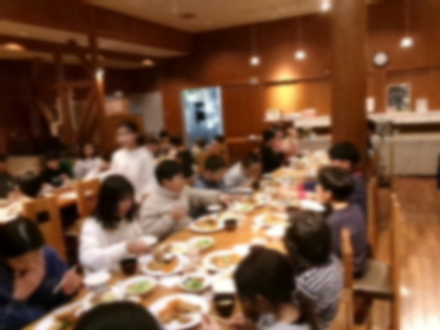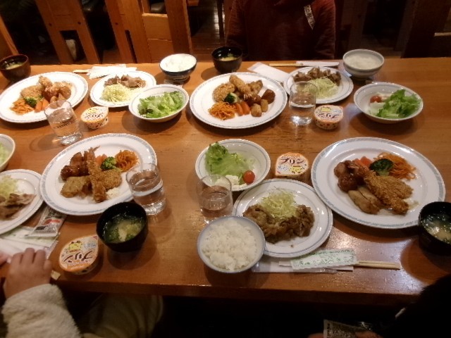 夕食の時間です。たくさんの献立が並んでいます。皆おいしそうに食べています。スキーでたくさん体を動かしたので、お腹がすきました。