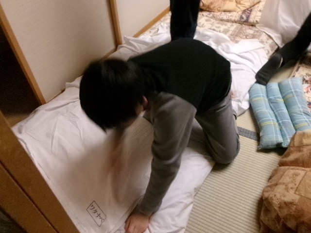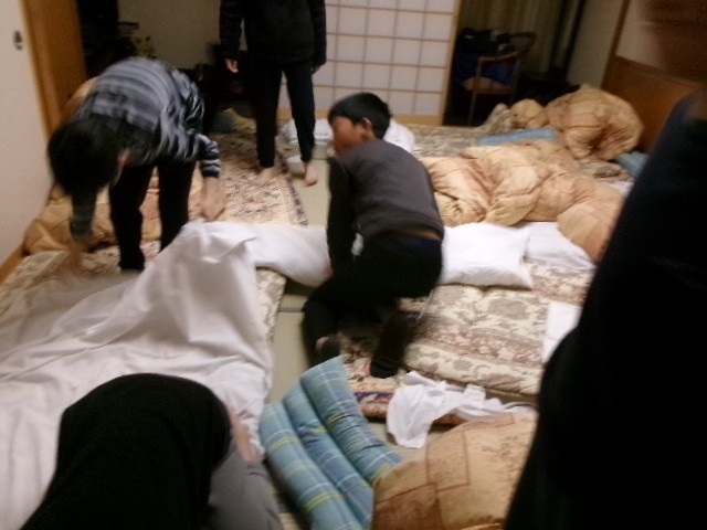 移動教室二日目、川上村の気温はマイナス13℃です。館内は暖かです。6時に起床し、布団やシーツを畳んでいます。朝食までの間に、身支度を整え、帰りの支度をしています。