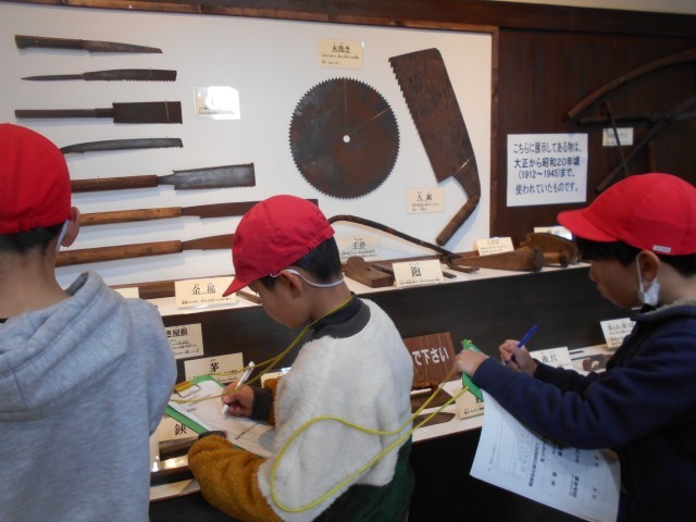 薬師公園では、グループになって公園内にある施設を探しました。ふるさと農具館では、昔の人々のくらしを支えてきた農具を見学しました。熱心にメモを取る姿が見られました。