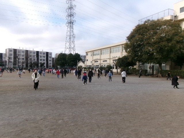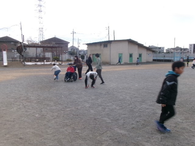 集会委員会が校庭にペットボトルのキャップをたくさん置きました。それをどのくらい集められるかを競うゲームでした。やまばと学級の子たちは車椅子でキャップを探しています。お昼の放送で結果を発表しました。毎回、工夫された集会を企画・運営してくれました。