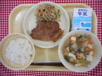 きょうは蒸し暑い日にぴったりな冷やしうどんでした。暑いときにも食べやすい麺類ですが、うどんだけだと栄養がかたよってしまいます。そこで給食では、汁にお肉、上にきゅうりやにんじんといった野菜もとれるように工夫しました。麺はゆでた後、水で冷やして氷と一緒に配缶しました。朝から楽しみにしてくれており、つるつるとよく食べてくれていました。また、芋類を組み合わせると、体を動かすのに必要なエネルギーもしっかり満たすことができます。大学芋も大人気で、また作ってください!という声をたくさん聞くことができました。