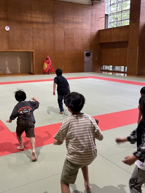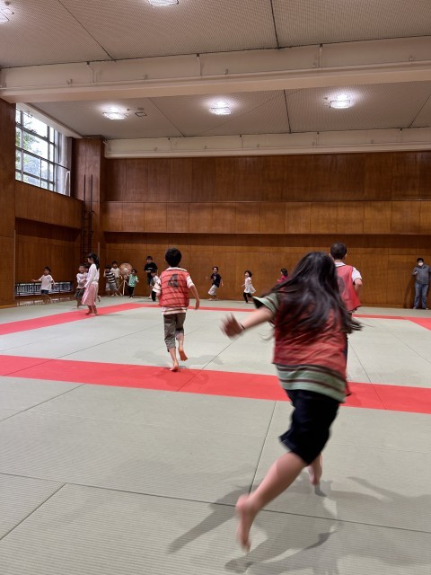 雨のため午前中は体育室で室内レクリエーションになりました。広い畳の上で思い切り運動するというのもなかなか貴重な体験です。みんな楽しんでいます。