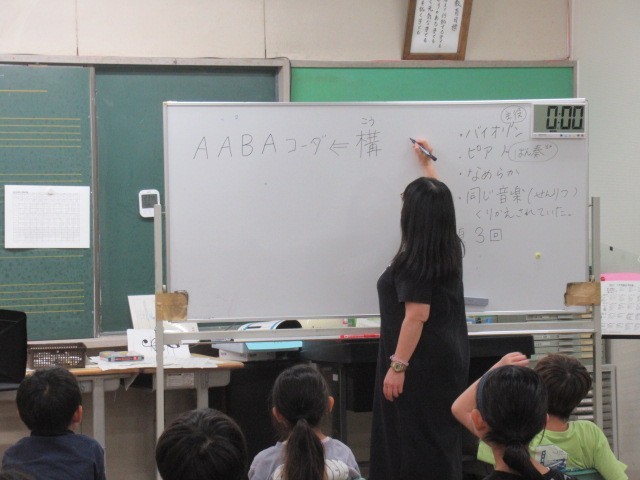 今日は鑑賞の授業です。まず、繰り返される旋律を体を使って表しました。その後とらえた旋律をもとに曲の構造について考えていました。なかなか難しい内容ですが、しっかりと理解して音楽の仕組みを楽しんでいました。