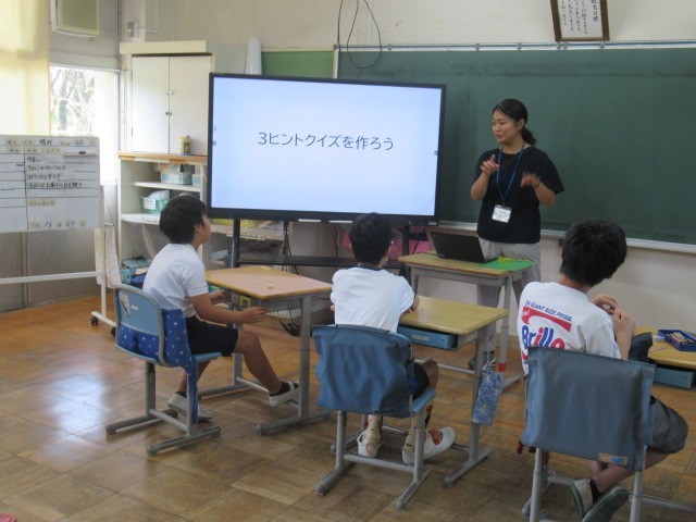 3つのヒントをから答えを出す問題作りをしています。楽しいクイズにするにはヒントの作り方や並べ方にも工夫が必要です。授業の最後にはみんなで問題を出し合って楽しみました。