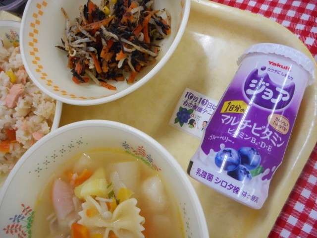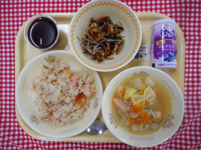 発酵乳、鮭ピラフ、ひじきとにんじんサラダ、秋野菜のスープ、グレープゼリー