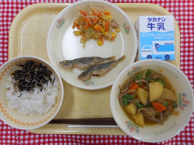 牛乳、ご飯、ひじきのふりかけ、カレー肉じゃが、豆あじのから揚げ、野菜炒め