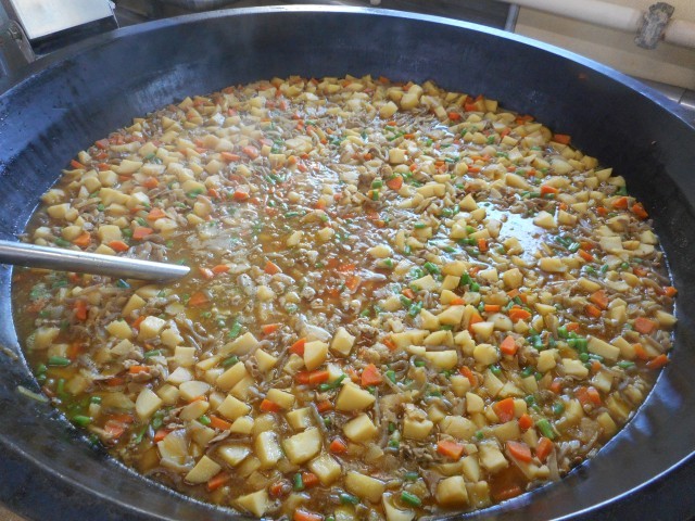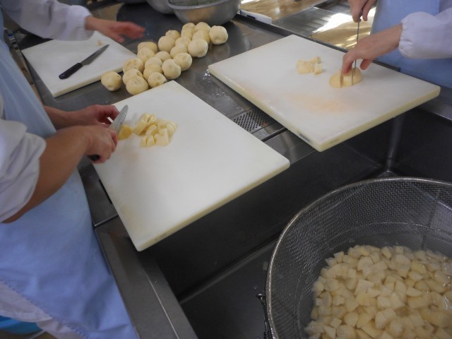 ひじきは、海藻の一種です。カリウム、カルシウム、マグネシウム、食物繊維、ヨウ素など、身体に必要な栄養素が多く含まれています。給食では、炒めて甘辛く煮たあと、ちりめんじゃこやかつお節を加えてふりかけにしました。このご飯毎日出してほしい!と言ってくれる児童がたくさんいました。カレー肉じゃがには、じゃがいもを50kg使いました。野菜の栄養が溶け込んだ汁まで美味しそうに食べてくれていたのでよかったです。