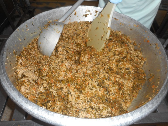きょうは新潟県のご当地給食です。「きりざい」は、刻んだ野菜や漬物を納豆に混ぜたものです。おかわりは長蛇の列ができていました!佐渡島では、新鮮な魚が獲れます。ブリにパン粉の衣をつけてカツにし、しょうゆの味のタレをかける「ブリカツ」という料理が人気だそうです。給食でブリを揚げた料理は珍しいようで、先生方の間でも好評でした。「のっぺ」は。里芋や根菜を煮込んだ煮物です。汁物にすることもあるようですが、給食では煮物として作りました。新潟の料理を楽しんでくれていてよかったです。