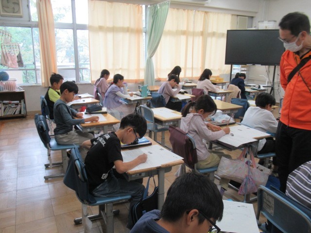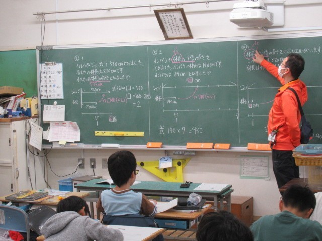 本日の算数シリーズ第3弾は4年生の「倍」の学習です。「割合」の学習につながるポイントとなるところです。大切なことは図に表して場面をイメージすることです。問題場面を図によって整理しながら解いていました。素晴らしい集中力でした。