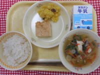 きょうは、運動会前の応援献立第二弾です。「勝つ」にちなんで、カリカリに揚げたカツにソースをかけた「チキンカツ」を作りました。鶏肉にはたんぱく質が多く含まれているので、運動の前に食べると筋肉がつきます。筋肉がつくと、身体を動かすと身体が軽く感じます。キャベツは消化を助ける働きがあるので、脂っこいものと一緒に食べると身体に負担がかかりません。チキンカツの残菜はわずか5個!ご飯と交互に食べたり、丼を作ったりして、よく食べてくれていました。きょうは、ゆっくり睡眠をとり、運動会にそなえてほしいです。
