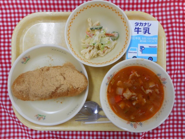 牛乳、きなこ揚げパン、マカロニサラダ、ミネストローネ