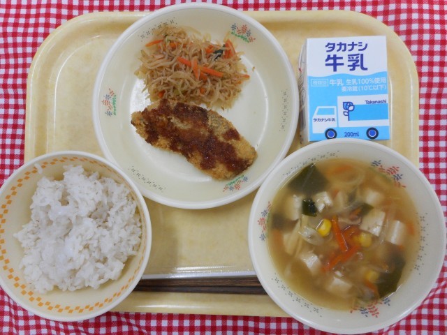 牛乳、麦ご飯、あじフライ、にんじんとじゃこのソテー、わかめスープ