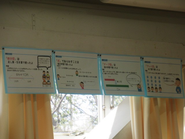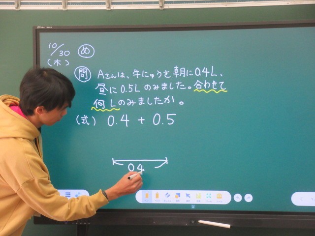 問題を読んだとき、たし算になるのかひき算になるのかについては、なんとなくわかる。でも、「なんでたし算になるの?」と聞かれると、みんなが納得する説明はなかなか難しいものです。今まで習った図を使って説明するという学習をしていました。図をうまく活用できると算数はとてもよく理解できるようになります。その技能をしっかりと身に付けてほしいと思います。