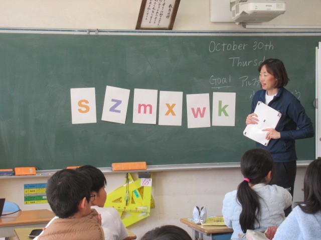 写真で写せなかったのが残念ですが、出題者がカードに書かれたアルファベットを体で表現します。もちろん、その文字が何なのかは出題者しか知りません。それぞれの子が「なんとかして」アルファベットを表そうとしている姿が微笑ましく、当てる側の子供たちもみんな笑顔で活動していました。言葉を覚えるときに、この楽しさが大切なのだなと思います。