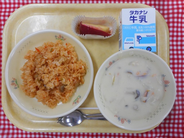 牛乳、チキンライス、ハロウィンスイートのシチュー、焼きりんご