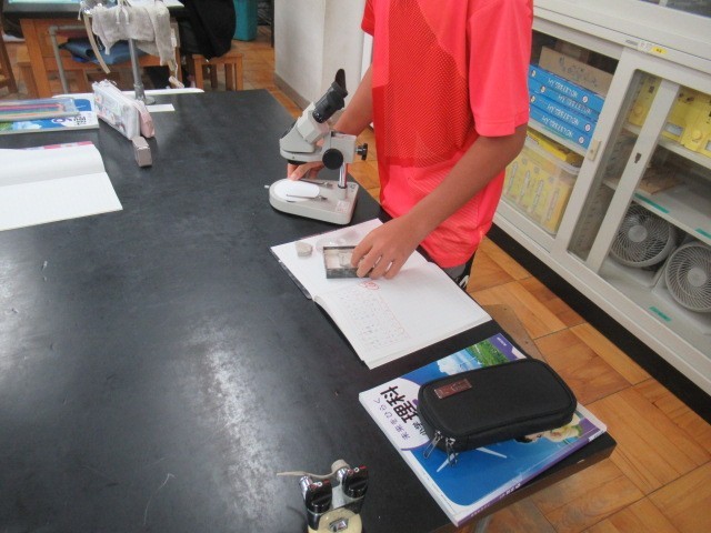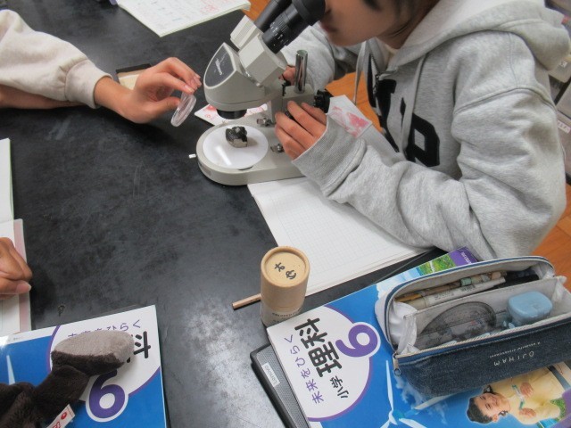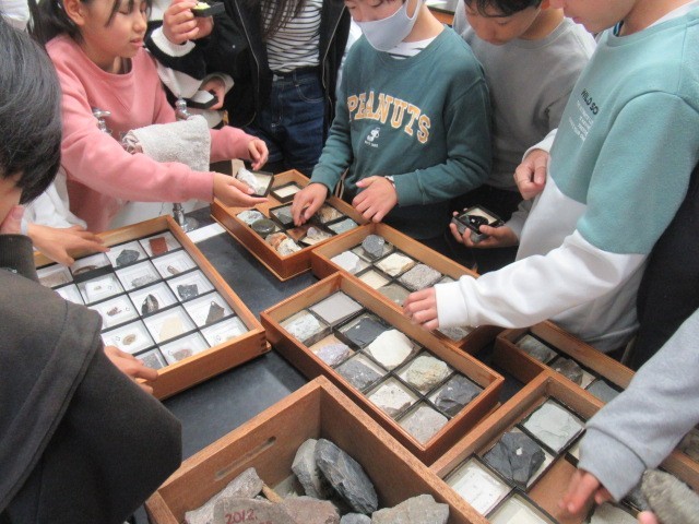 何気なく目にしている石ですが、その生成の過程にはいろいろなパターンがあります。じっくり観察することでその石がどのようにしてできたのかがわかるのです。子供たちは手触りを確かめたり、拡大して見たりすることでその石の特徴をつかもうとしていました。この学習を終えて、道端に落ちている石にも興味がわいたら、毎日楽しいですね。